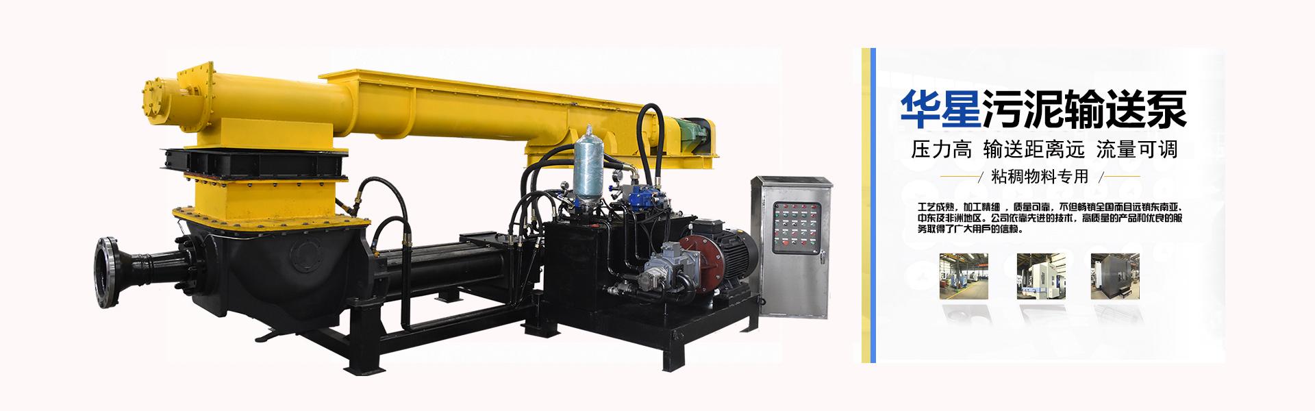 市政污泥輸送泵。華星YNC系列液壓驅(qū)動雙缸活塞泵是由液壓驅(qū)動推動兩個油缸來回運動,再推動S擺管左右擺動達到輸送濃縮污泥,排出壓力大,遠距離輸送含大顆粒直徑的污泥,性能特別優(yōu)越。